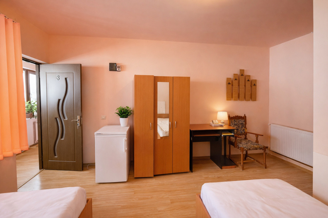 Se oferă spre închiriere cameră cu baie proprie având o suprafață utilă de 25 mp situată într o casă tip pensiune formată din patru camere. Camera este luminoasă,bine întreținută și mobilată cu două paturi individuale fiind potrivită pentru una sau două persoane.