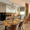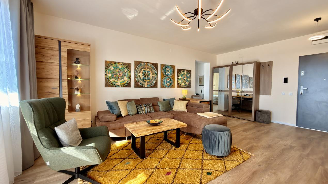 Încă de la intrare se simte atenția pentru detalii. Spațiul este generos și armonios, iar livingul open-space cu bucătăria complet utilată creează un ambient modern și primitor. Finisajele în tonuri calde, mobilierul ales cu grijă și lumina naturală abundentă conturează o atmosferă relaxantă, perfectă pentru momentele petrecute acasă.