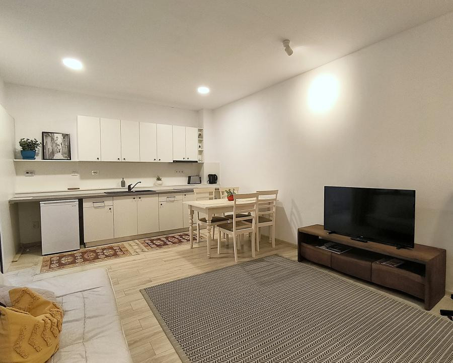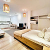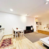 Prima garsonieră are o suprafață de 34 mp, este renovată și se vinde complet mobilată și utilată. Este compusă din cameră cu zonă de bucătărie integrată și baie proprie. Spațiul este pregătit pentru închiriere în regim hotelier, putând genera venit imediat, dar poate servi la fel de bine ca locuință individuală, având o compartimentare eficientă și funcțională.