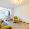 Livingul este spațios și modern, mobilat minimalist, care oferă un contrast elegant. Piesa de rezistență este zona de relaxare, cu o canapea și un fotoliu în nuanțe de verde crud și motive florale, care aduc un plus de prospețime și energie camerei.