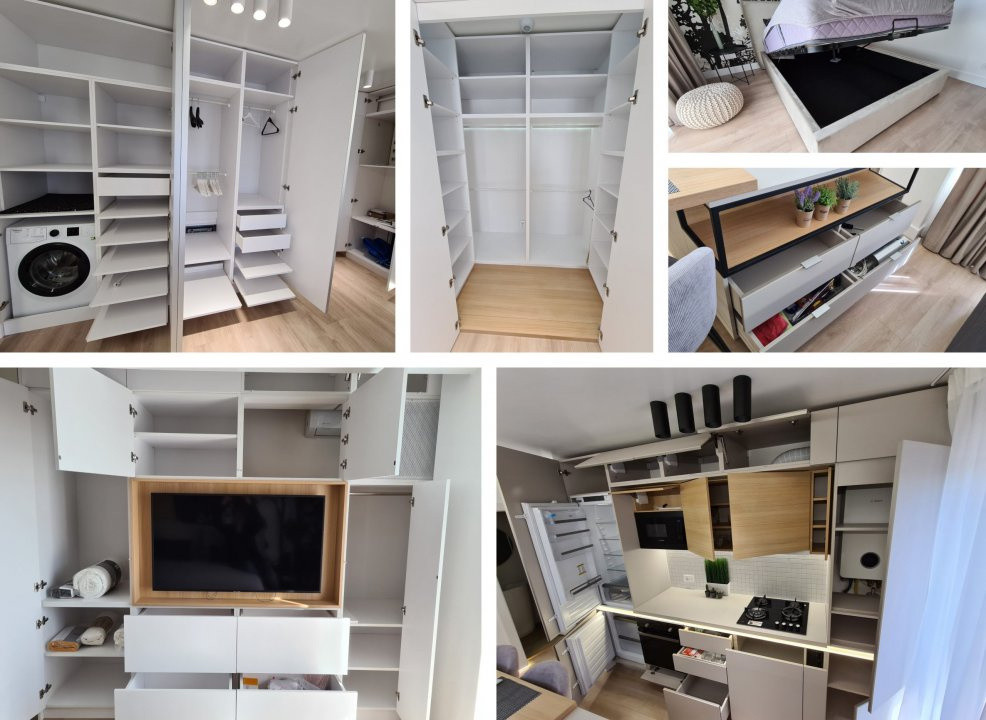 Defapt... tot apartamentul are mobila facuta la comanda (executata de catre talentatii MĂśbel) si fiecare spatiu este luat in calcul si folosit la maxim, beneficiind astfel de AMPLEEE locatii de depozitare.