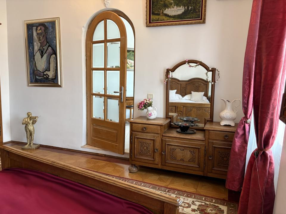 Ceea ce îl face unic este stilul rafinat și colecția impresionantă de artă: mobilier din lemn masiv sculptat manual, piese adevărate de artizanat, oglinzi de cristal care amplifică lumina și eleganța, tablouri originale și numeroase obiecte de artă care transformă fiecare cameră într-o mică galerie. Atmosfera este caldă, sofisticată și plină de personalitate – un interior care îmbină confortul cu rafinamentul artistic.