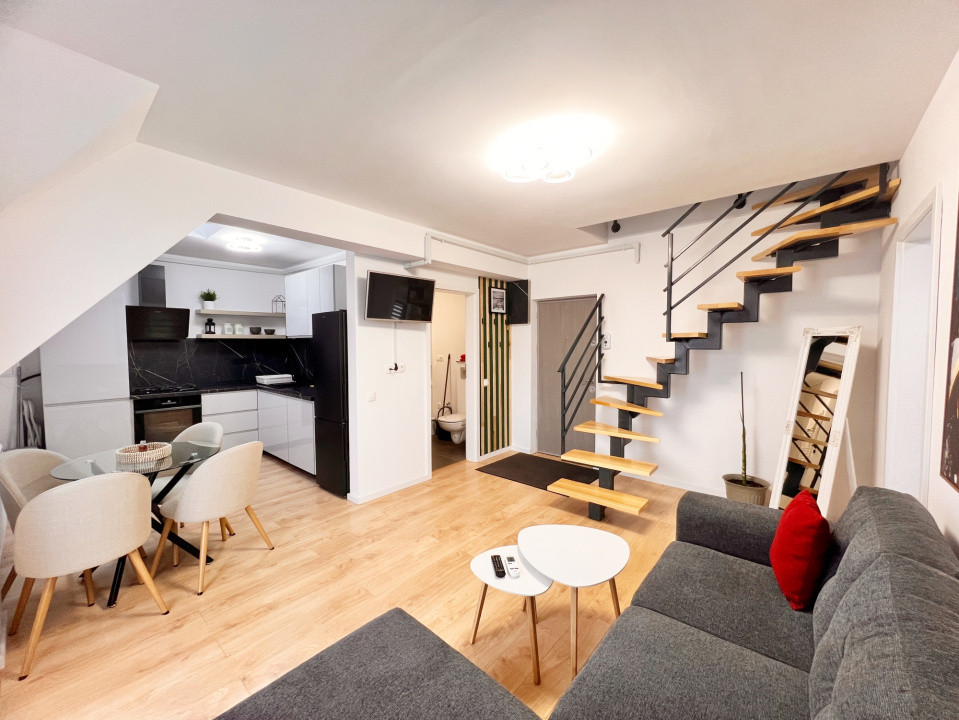 Living spațios cu bucătărie open-space, luminos și primitor.