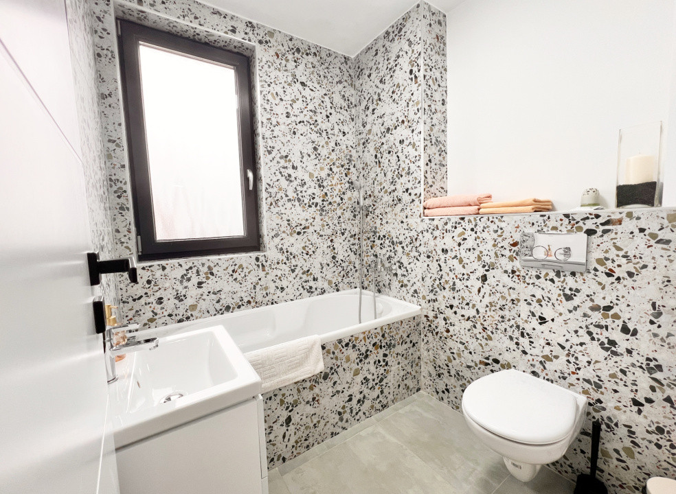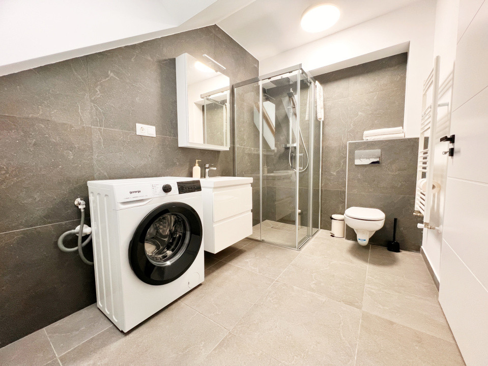 Două băi complet utilate, câte una pe fiecare nivel.