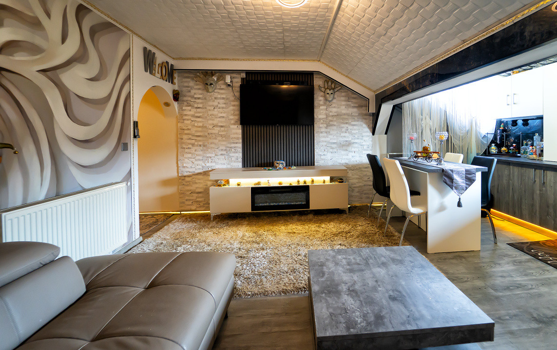Locuința este complet decomandată, fiind predată mobilată și utilată sub o tematică elegantă de inspirație orientală: