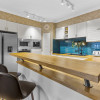 Livingul open-space este generos, luminos, cu o priveliște spectaculoasă către Piața Apollonia Hirscher și clădirile emblematice din centrul orașului. Bucătăria modernă, complet echipată cu electrocasnice de ultimă generație și o insulă cu blat din lemn masiv, se integrează perfect în zona de dining și living – spațiul ideal pentru seri relaxante sau întâlniri memorabile cu cei dragi.
