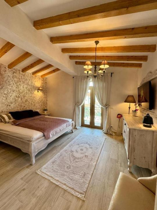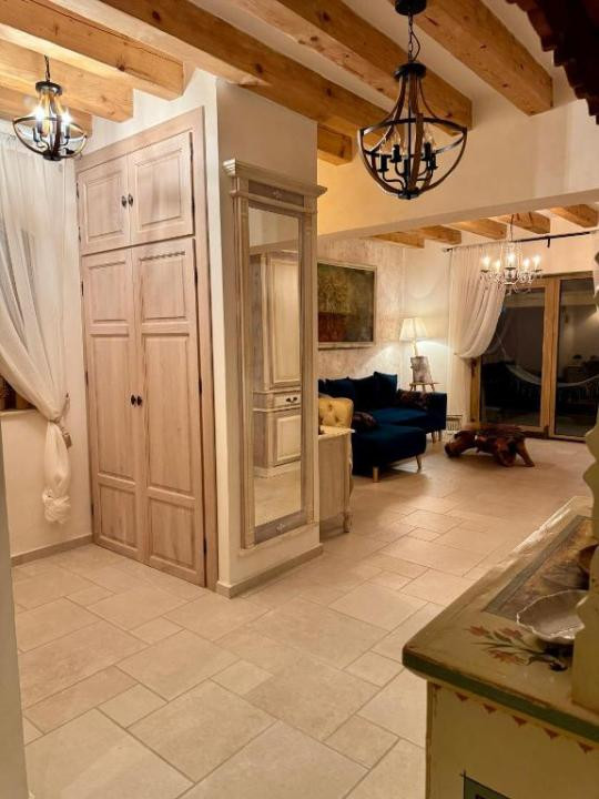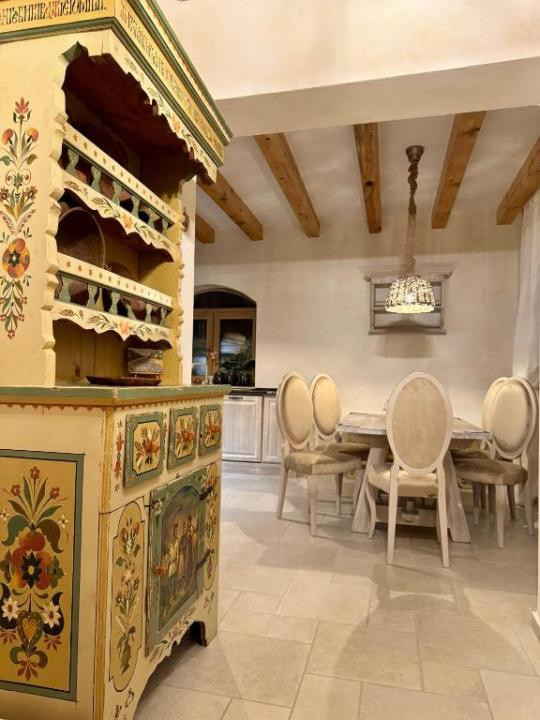 mobilier din lemn masiv, periat, sculptat și pictat manual, finisaje alese cu grijă și o atmosferă caldă, care nu poate fi reprodusă în locuințele standard.