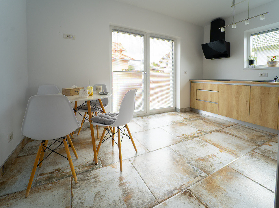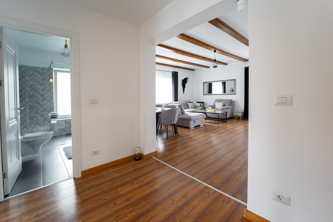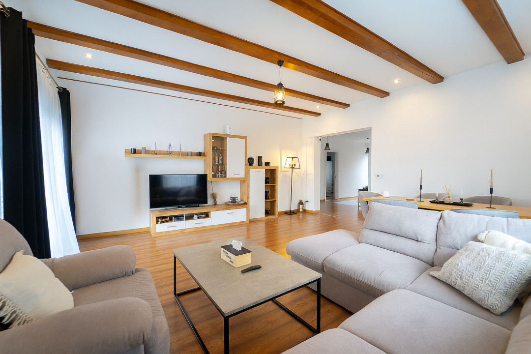 Living generos de 29 mp, luminos, cu acces direct către terasa acoperită — un spațiu ideal pentru relaxare în orice sezon;