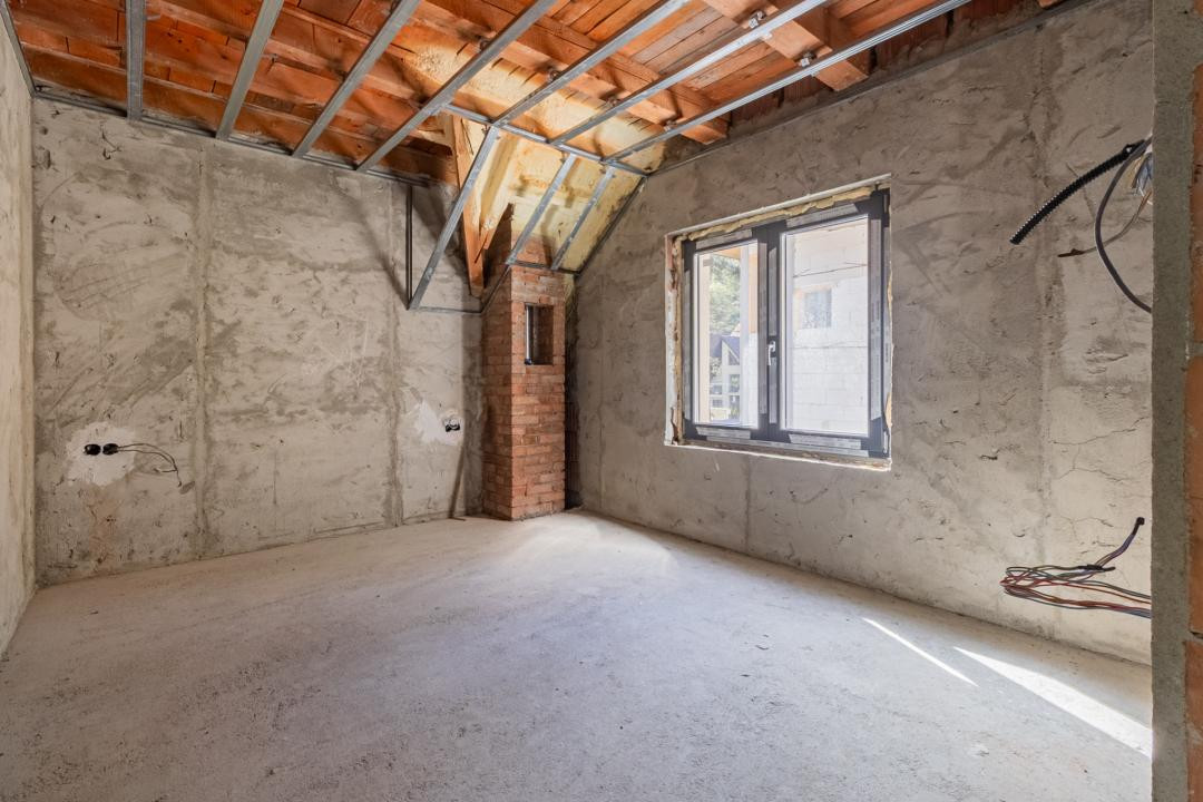 Construcția este realizată din cărămidă și se află în stadiu semifinisat, ceea ce îți oferă libertatea de a o amenaja după propriul stil. Casa este izolată cu vată bazaltică, un detaliu esențial pentru eficiența termică și confortul pe termen lung. Instalația electrică este deja realizată, iar sistemul pentru încălzirea în pardoseală este pregătit, facilitând implementarea rapidă a unui sistem modern de încălzire. De asemenea, casa este placată pe exterior cu piatră naturală.