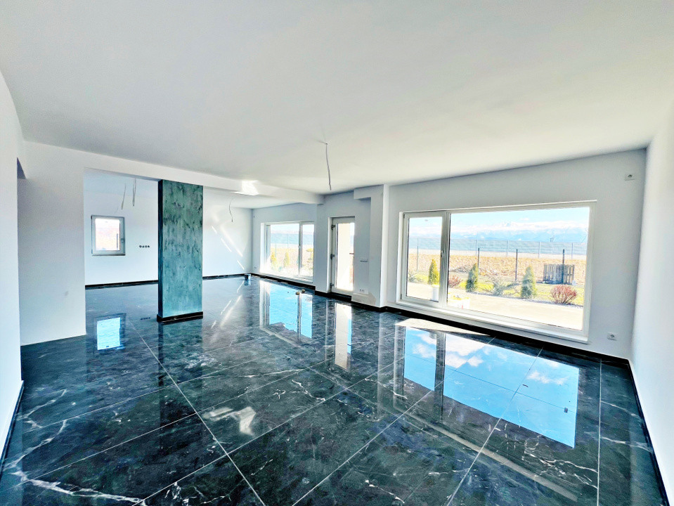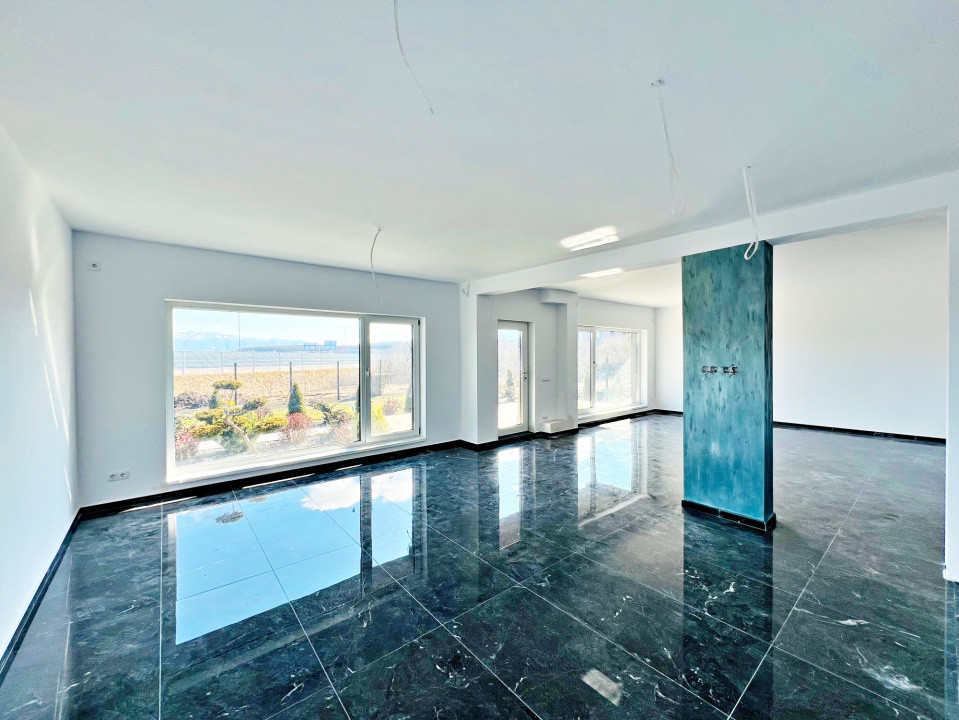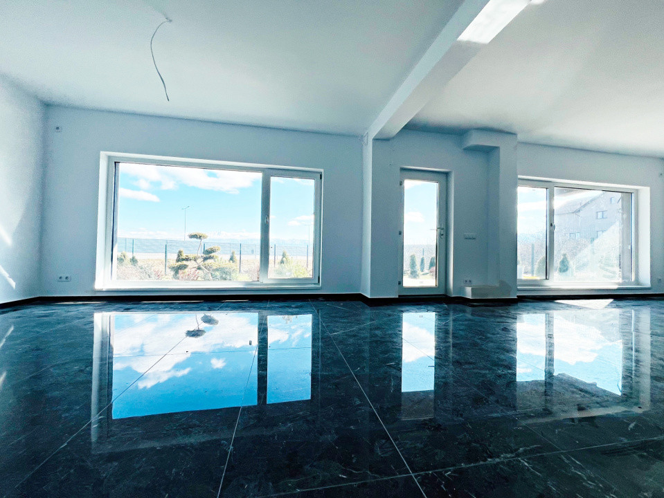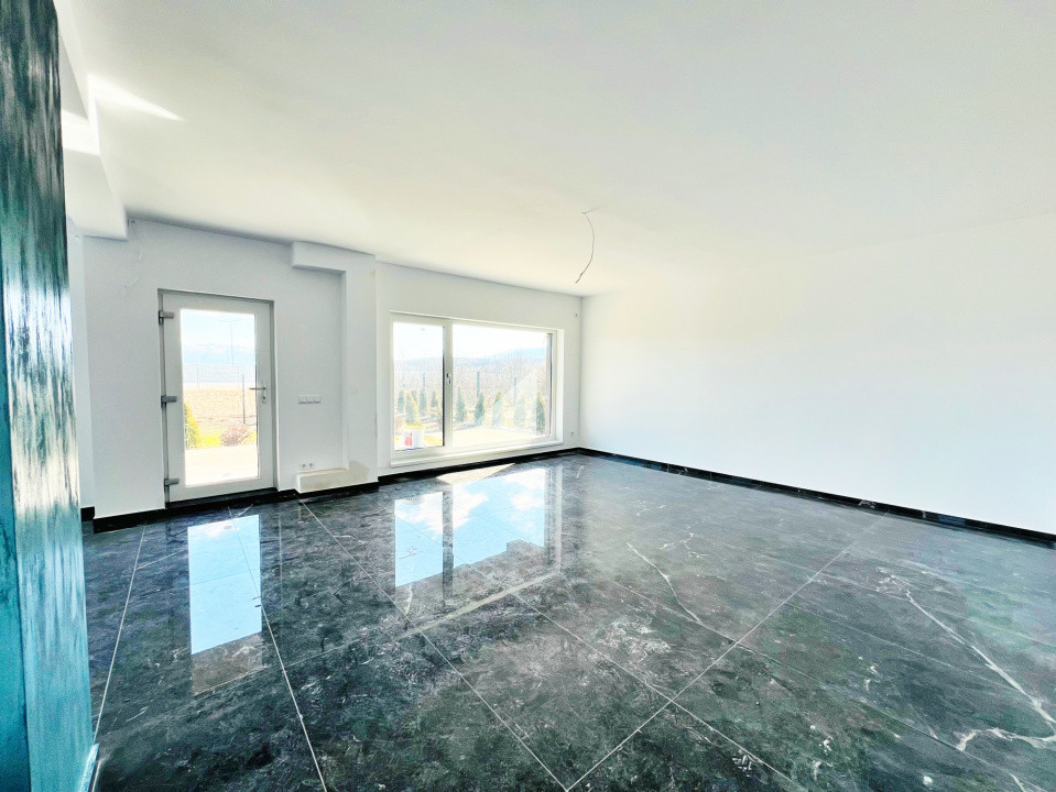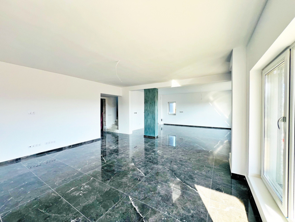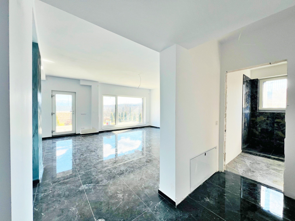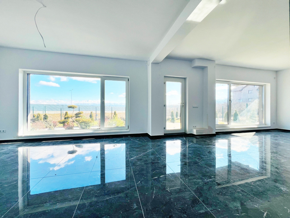 Parterul e dominat de un living luminos (30,5 mp) cu acces la terasă, o bucătărie spațioasă (27,1 mp), baie, spațiu tehnic, debara și un garaj generos (36,5 mp). La nevoie, acesta poate fi transformat într-un apartament tip studio, complet separat.