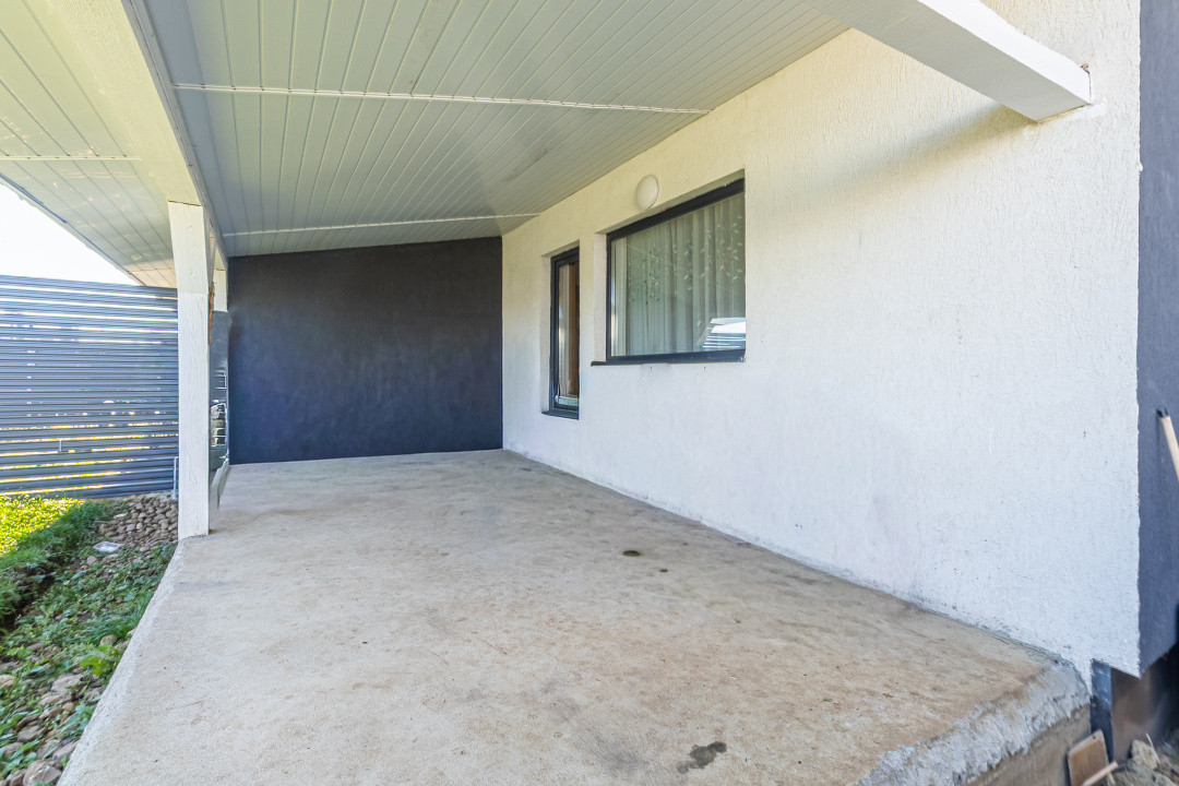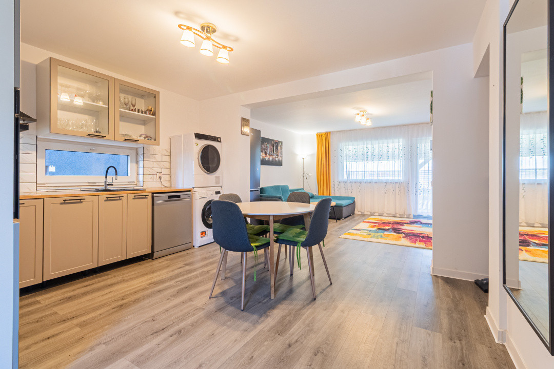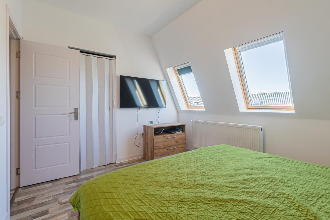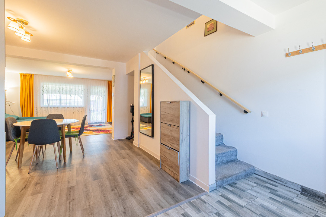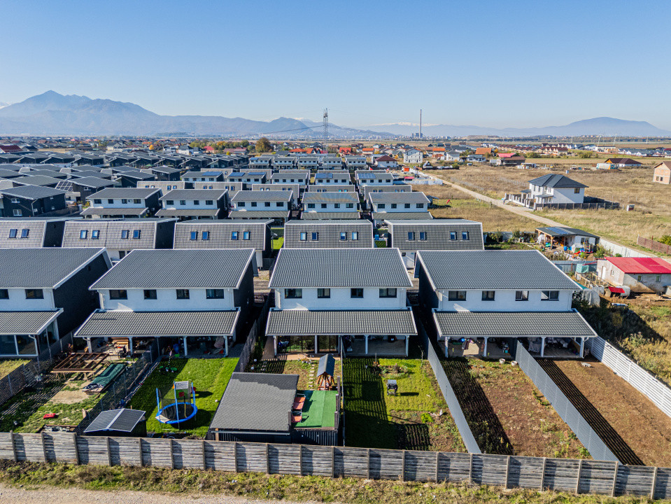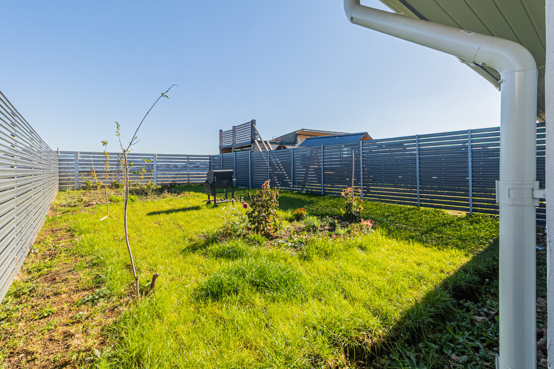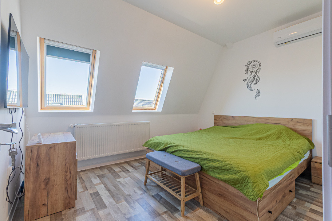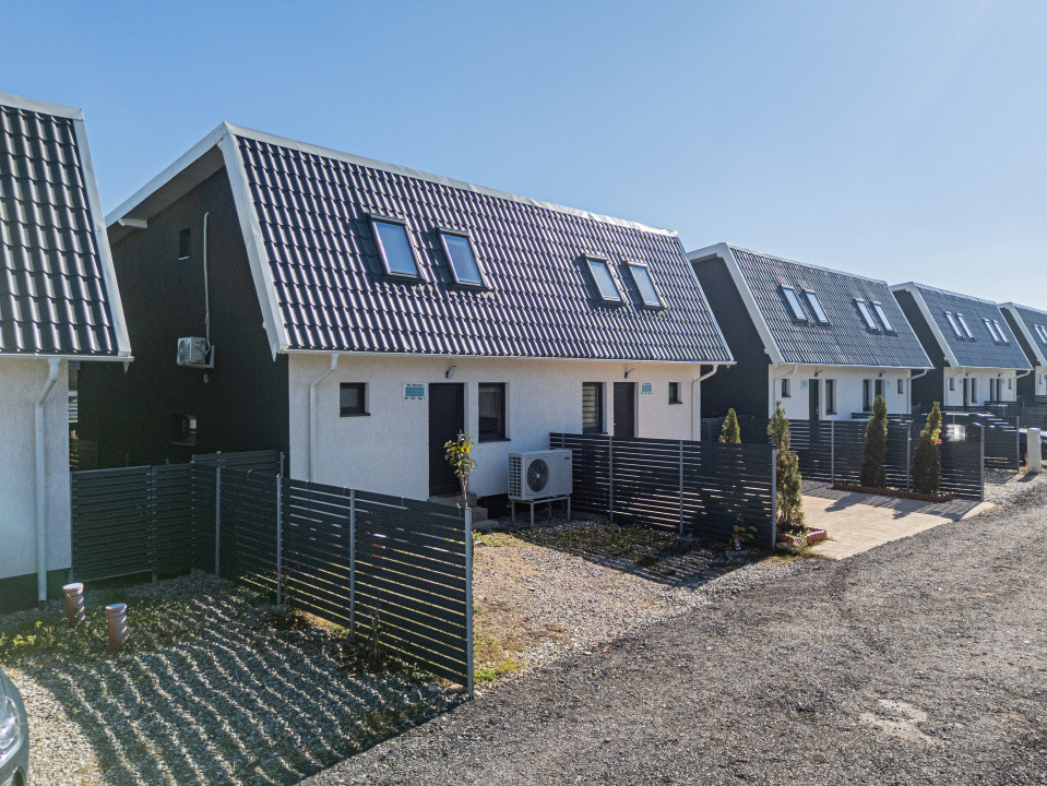 Locuința P+M, parter și mansardă, construită în anul 2024, se vinde mobilată și utilată complet, conform fotografiilor. Este echipată cu frigider incorporat, cuptor, plită, hotă, mașină de spălat vase, mașină de spălat și uscător de rufe, televizoare. Suprafața utilă este de 89,7 mp, terasa acoperită are 16 mp, iar terenul aferent este de 256 mp.