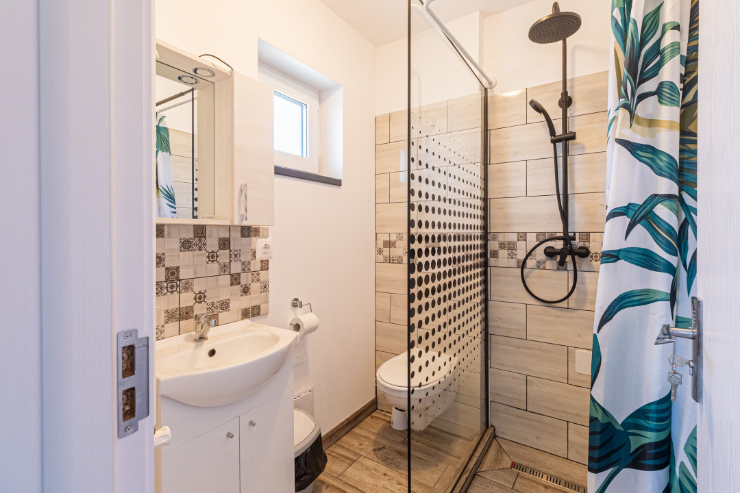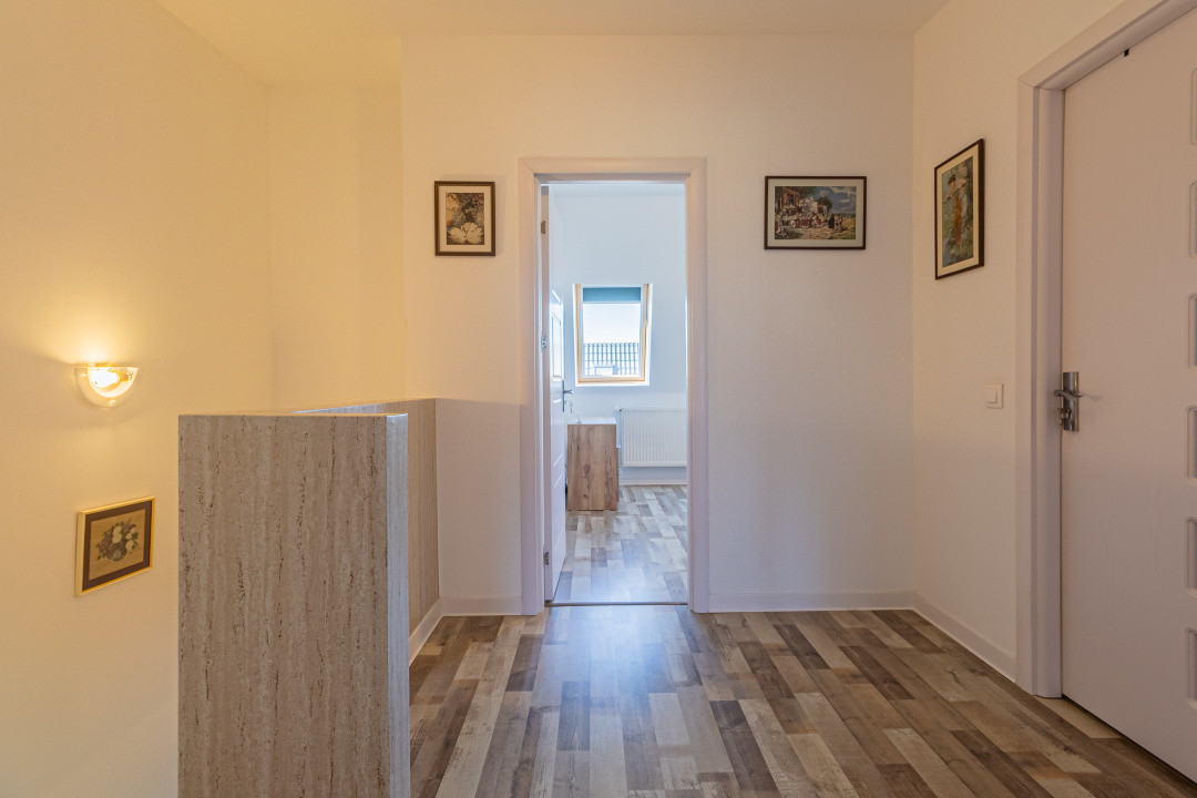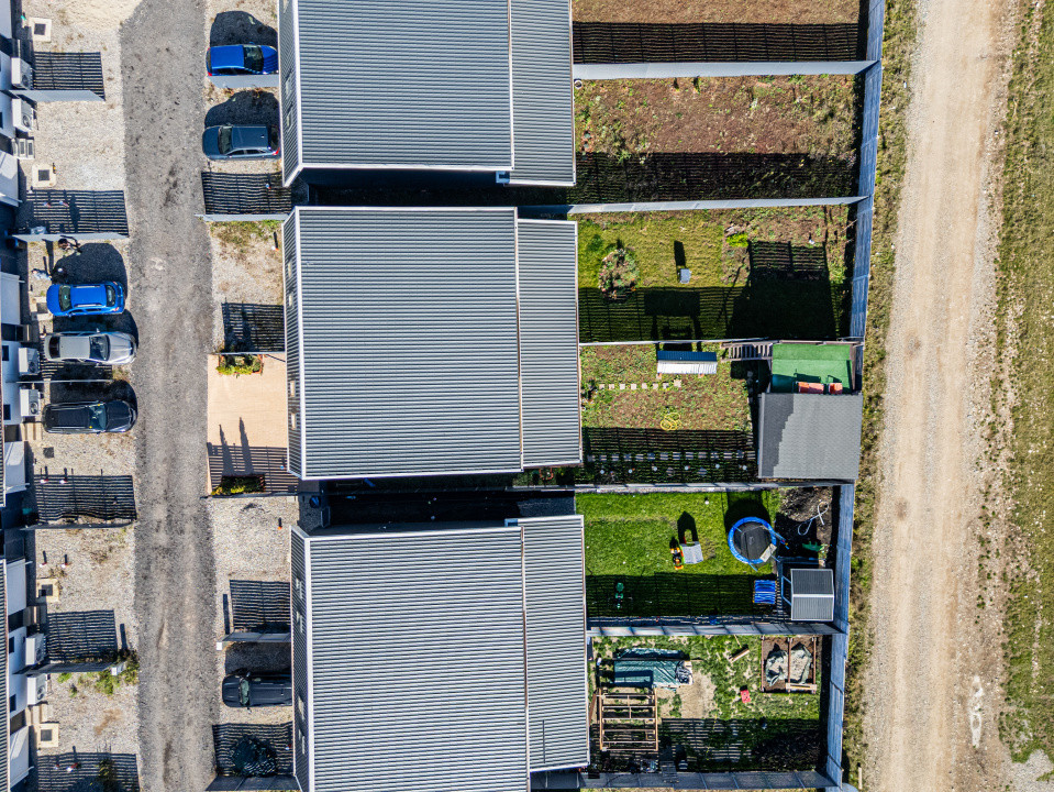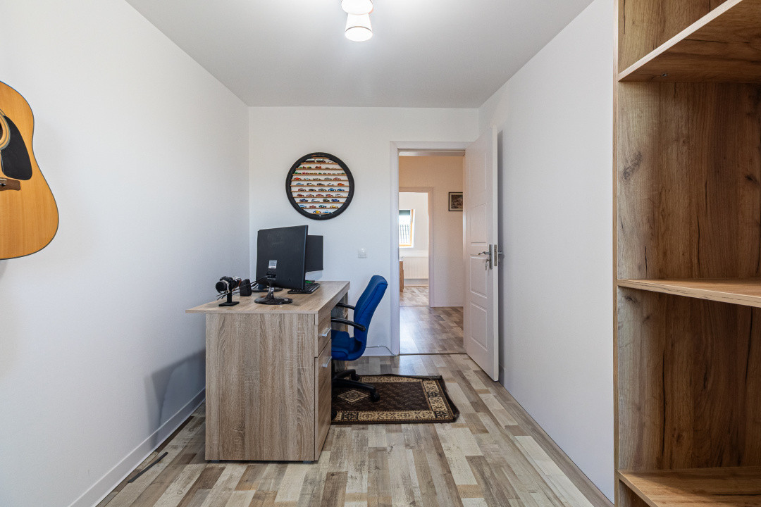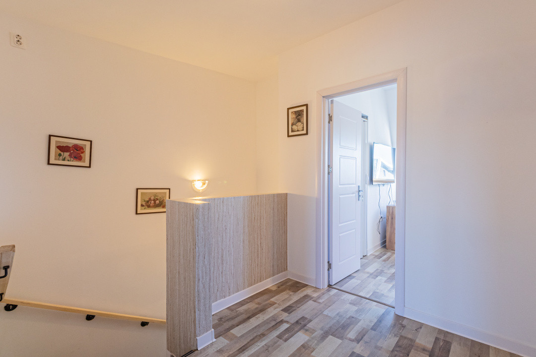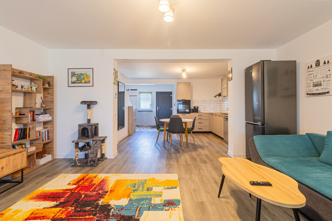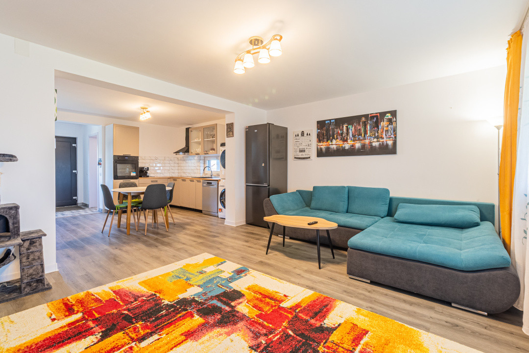 Locuința P+M, parter și mansardă, construită în anul 2024, se vinde mobilată și utilată complet, conform fotografiilor. Este echipată cu frigider incorporat, cuptor, plită, hotă, mașină de spălat vase, mașină de spălat și uscător de rufe, televizoare. Suprafața utilă este de 89,7 mp, terasa acoperită are 16 mp, iar terenul aferent este de 256 mp.