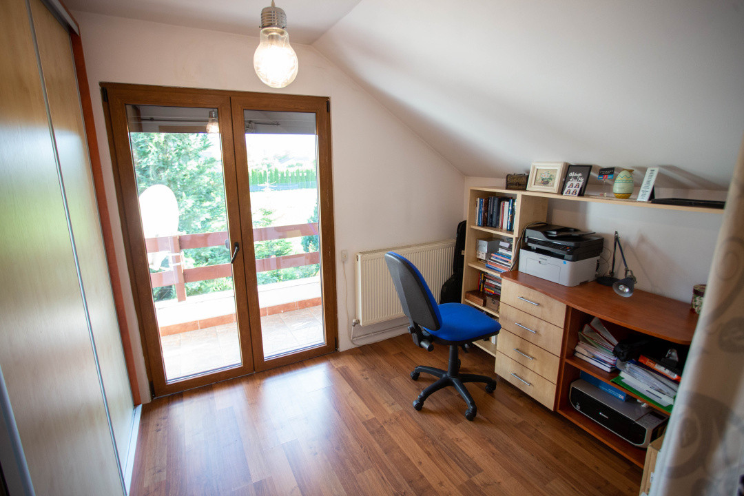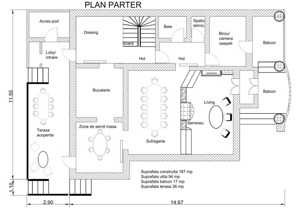 Parter: Zonă de zi formată din living, loc de luat masa, bucătărie, birou (poate fi dormitor), baie și ieșire pe o terasă de 36 mp.