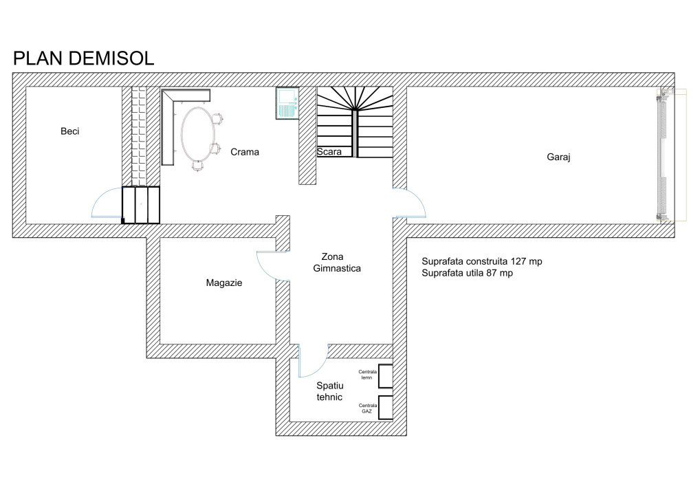 Demisol: Garaj, cameră tehnică, sală de sport, cramă și spații de depozitare.