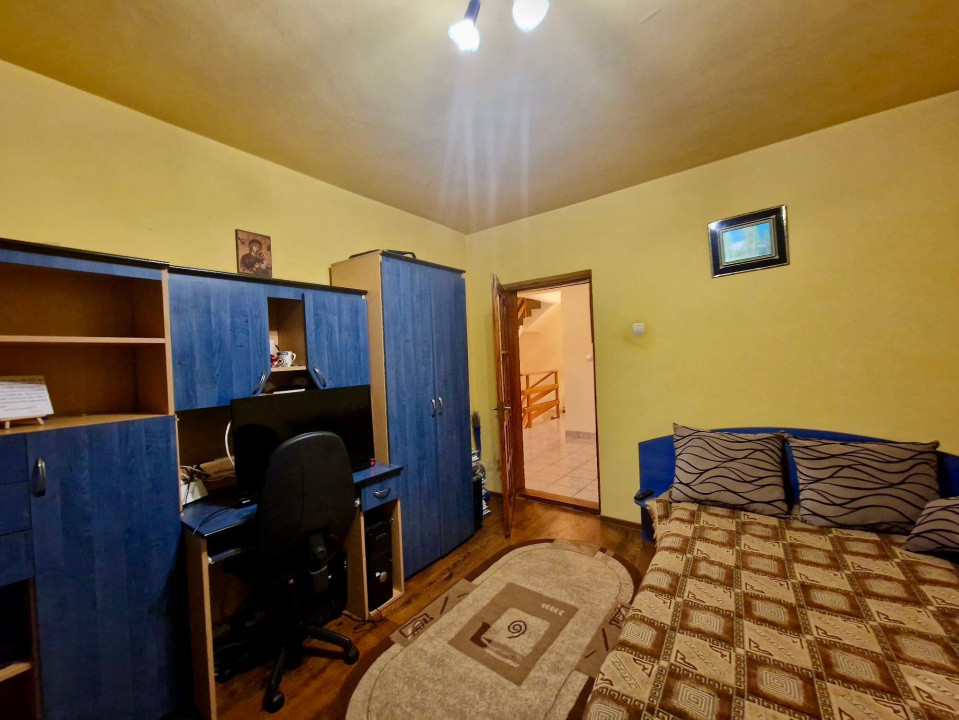Are un etaj și o mansardă, cu 8 camere în total (5 + 3 la mansardă), bucătărie mare, 2 băi și garaj.