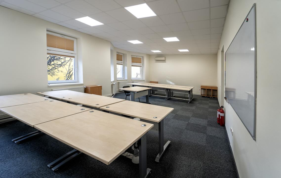 Tehnologie de lucru: Whiteboard-uri generoase, ecran de proiecție retractabil, TV Panasonic și sisteme de aer condiționat.