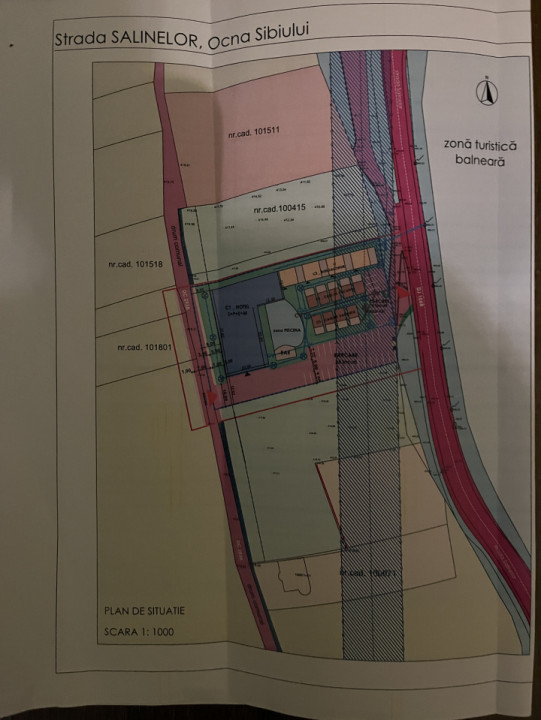 Conform PUZ aprobat prin HCL 35/2021 (proiect nr. 44/2017), terenul are destinație pentru spații de cazare și alimentație publică, cu regim de înălțime S+P+1E+1R, un POT maxim de 40% și un CUT maxim de 1,0. Distribuția terenului este structurată astfel: zonă construcții 1.493,8 mp, zonă parcare și circulații 1.280,4 mp, spații verzi și alei pietonale 1.202,1 mp și teren cedat pentru drum 144,3 mp.