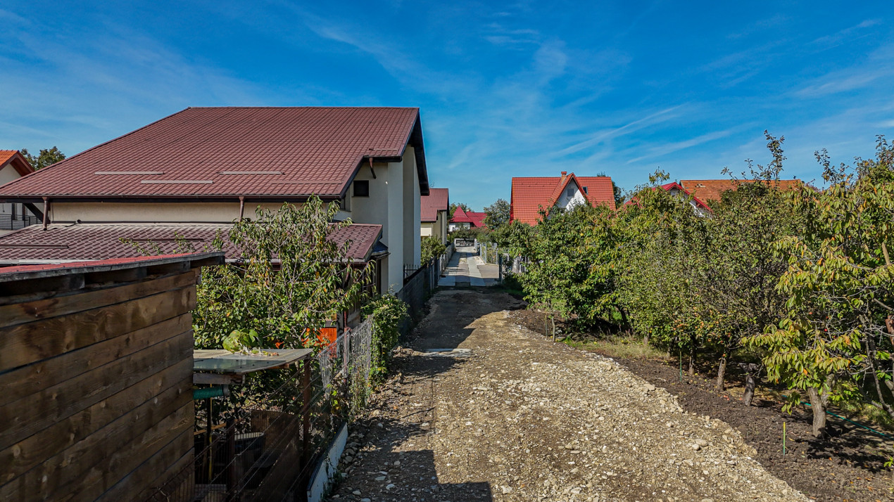 Accesul la teren se face printr-un drum privat cu lățimi variabile între 4 și 6,5 metri, ceea ce asigură un front stradal generos de 28 de metri. Dimensiunile terenului permit o adâncime de 15-17 metri, iar certificatul de urbanism existent permite construcții cu un procent de ocupare a terenului de 30%, un coeficient de utilizare de 0.9 și un regim de înălțime S+P+1+2E, ceea ce îl face ideal pentru diverse proiecte rezidențiale.